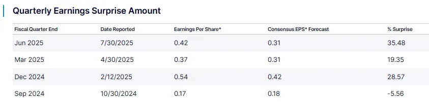 • Jun 2025: reported $0.42 vs forecast $0.31 (+35.5%)