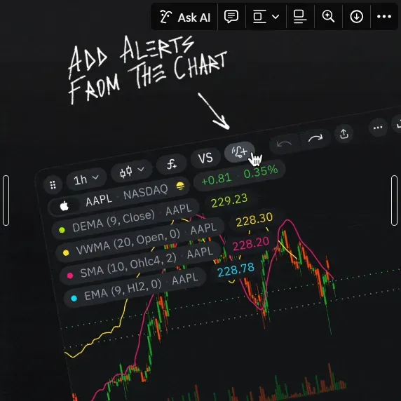 You can quickly create an alert by clicking the bell icon that appears when you hover over any point on the chart. This method automatically fills in the current price level or indicator value as your target.