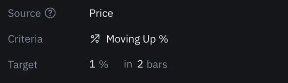 Please note that the Target values will vary based on the selected criteria. For the Crossing criterion, you only need to specify the price that triggers the alert. For the Moving up % criterion, the target will be the desired percentage increase over a specified number of bars. In the screenshot below, the daily timeframe is shown, indicating that 2 bars represent 2 days.