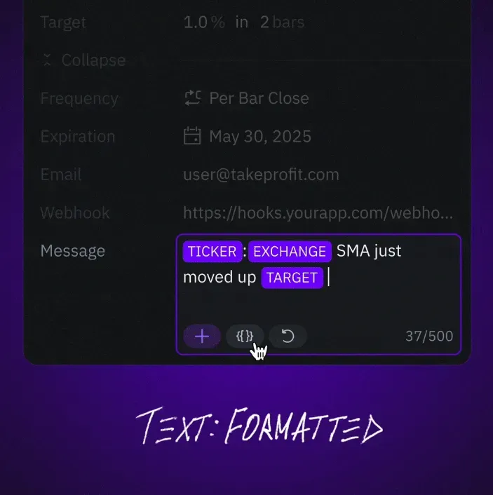 Example: Template: {{ticker}} {{condition_type}} {{condition_source_1}} Output: TSLA Crossing Down 144.68.