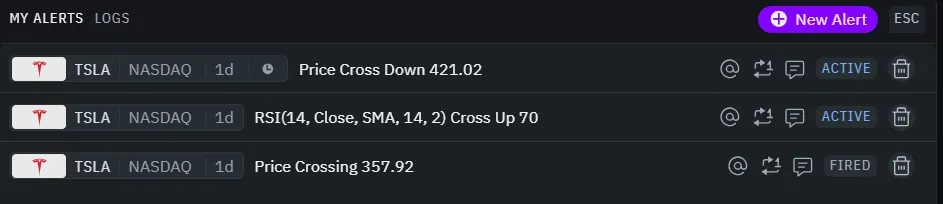 TakeProfit alerts are immediate notifications that trigger when the market meets your custom criteria. For example, you can set up an alert to notify you when "TSLA crosses above $150."
