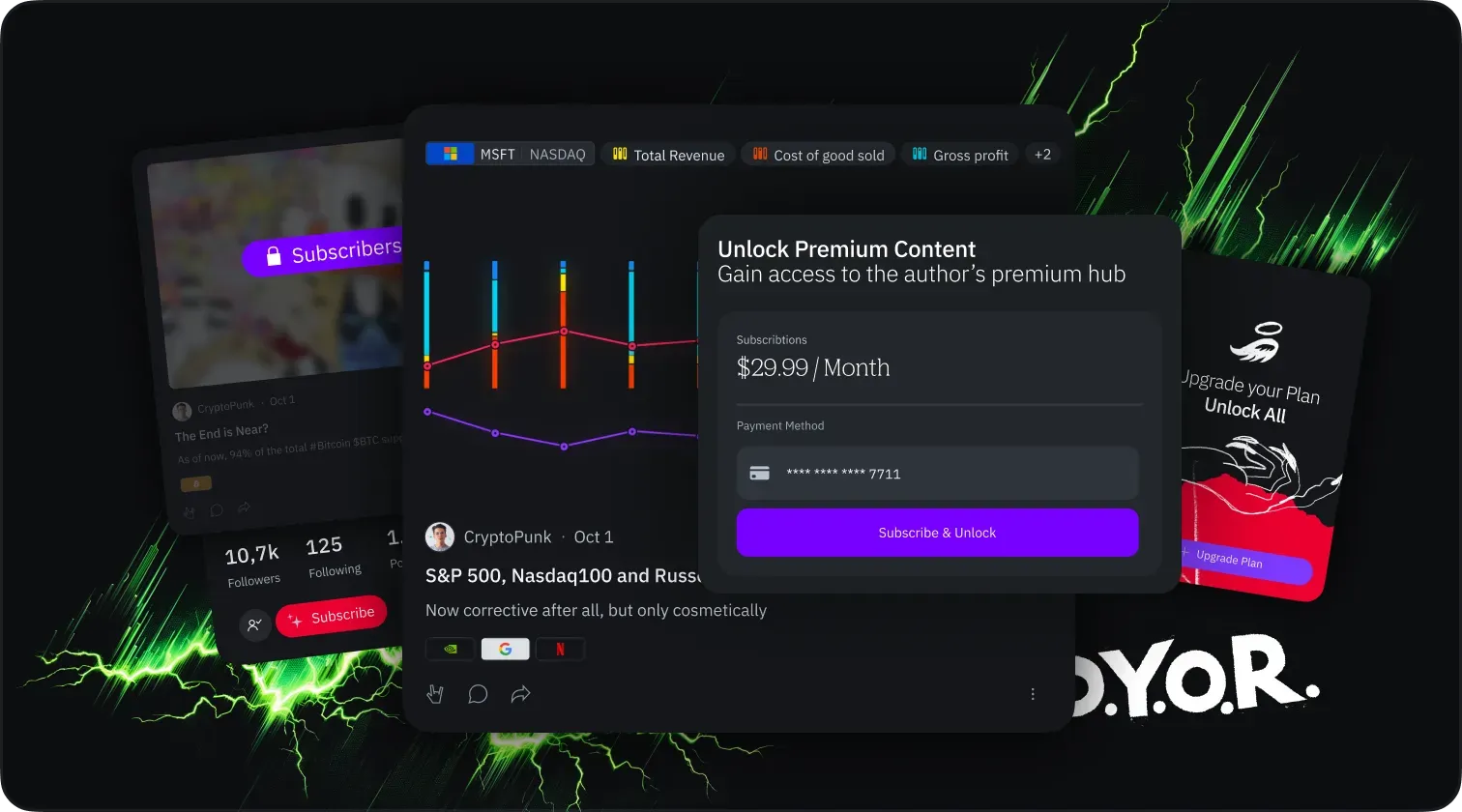 Substack takes 13.6% — we take nothing. Paywall your content — posts, charts, financials, videos — and charge monthly. Your audience, your hub, your revenue. Keep 100% from every invited subscriber.